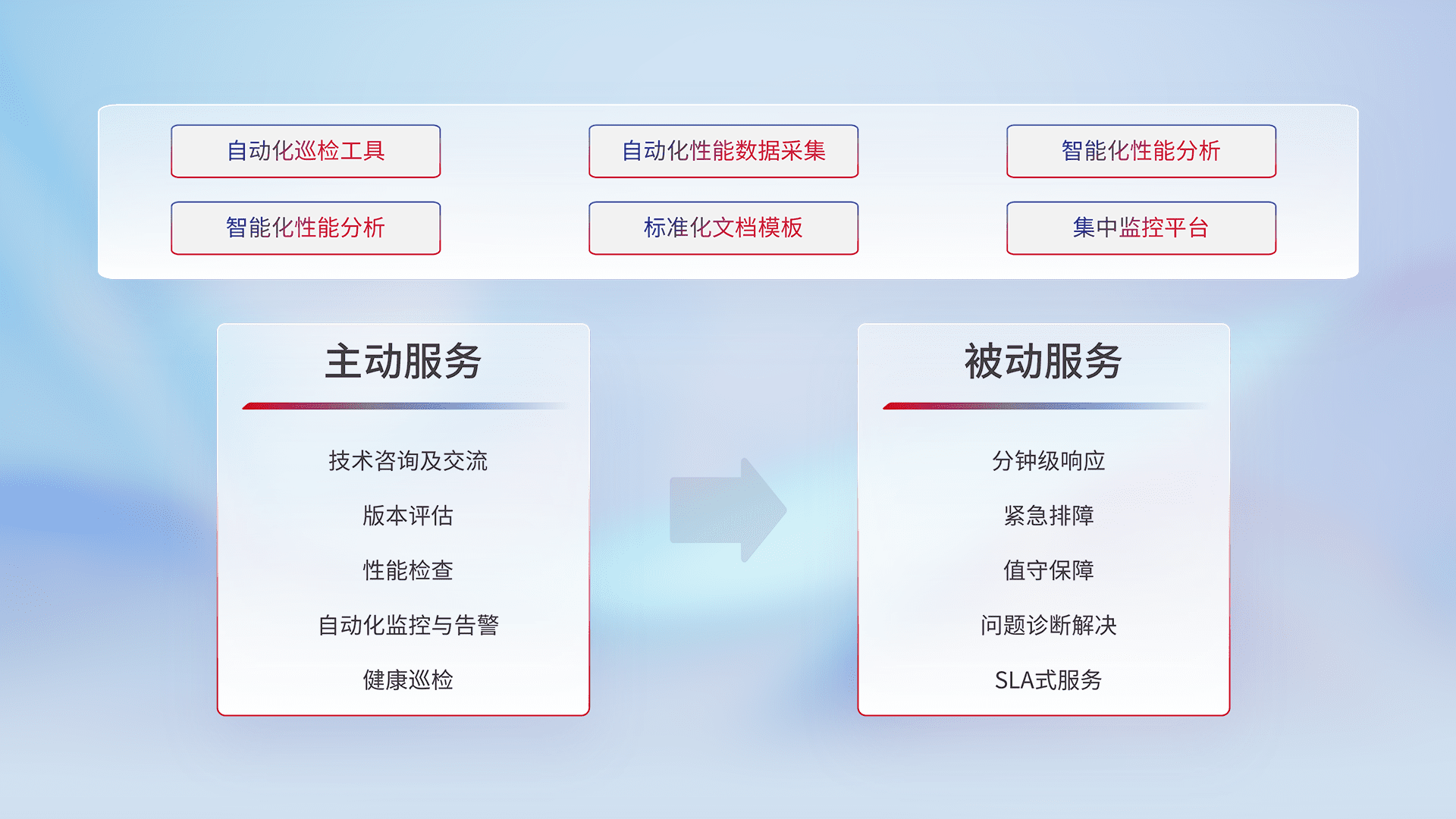 智能化工具和标准化文档,,保障服务质量,,,,提供主动服务(包含技术咨询、、、版本评估、、、、性能检查、、、自动化监控与告警、、、、健康巡检)和被动服务包含(分钟级响应、、、紧急排障、、值守保障、、、、问题诊断解决、、、SLA服务)。。